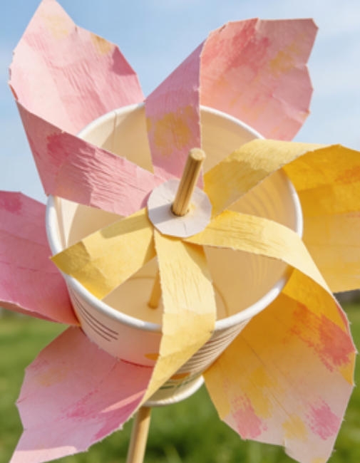 用剪刀將一次性紙杯剪出風車的形狀,這一步可以讓孩子參與設計,如決定風車葉片的數量和形狀 ,培養他們的設計思維。 -