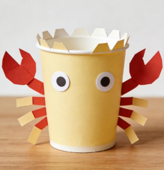用彩色手工紙將一次性紙杯包裹裝飾,作為螃蟹的身體,可以選擇孩子喜歡的顏色,如紅色、橙色等。 -