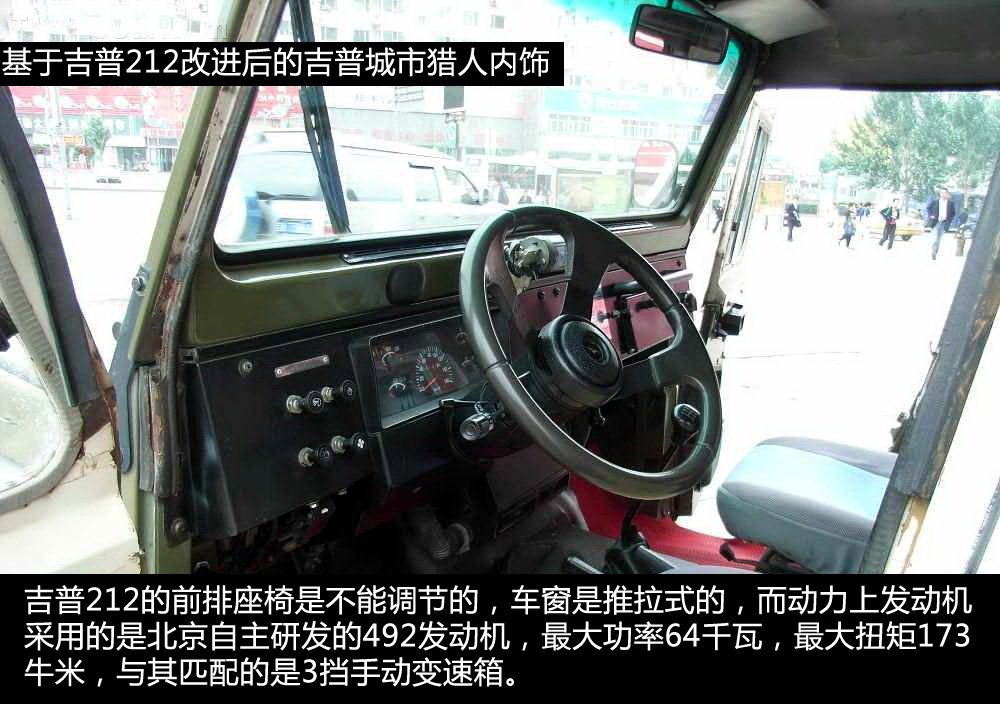 吉普212的前排座椅是不能調節的,車窗是推拉式的,特別要提的是該車后車窗非常小,只有差不多A4紙那么大,在倒車的時候基本用不上。另外該車的油箱有兩個,一只備用油箱在副駕駛員的座位下面;另一只在后備箱里。動力方面,在這款車發動機采用的是492發動機,最大功率64千瓦,最大扭矩173牛米。變速箱只有4個擋位,三個前進檔和一個倒車檔。