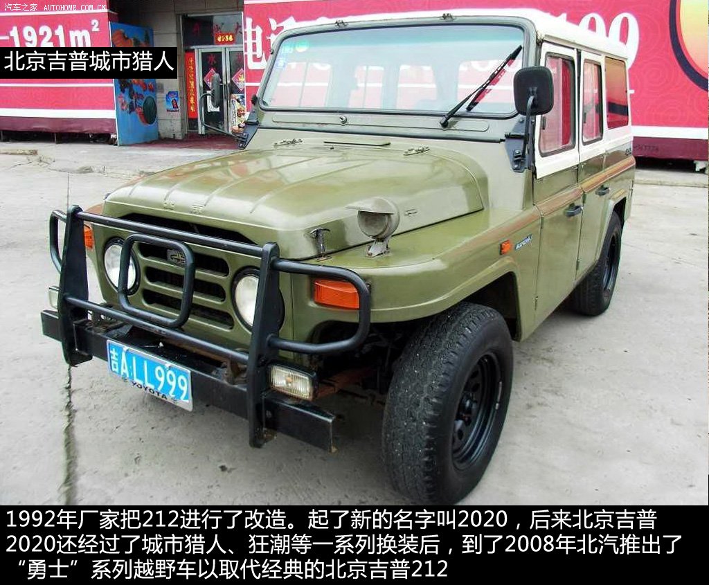 發展到90年代,1992年廠家把212進行了改造。起了新的名字叫2020,在北京的兩家工廠生產,后來北京吉普2020還經過了城市獵人、狂潮等一系列換裝的衍生車型后,到了2008年北汽推出了“勇士”系列越野車以取代北京吉普212,并在09年國慶閱兵式上大放光彩。