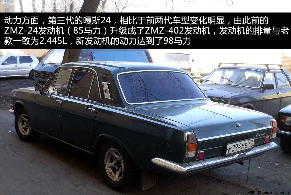 最值一提的還是第三代的嘎斯24,相比于前兩代車型它的變化要更加明顯,首先動力上由此前的ZMZ-24發動機(85馬力)升級成了ZMZ-402發動機,排量與老款一致為2.445L,不過新發動機引進了全新的化油器及冷卻系統,使得其動力達到了98馬力,此外在外觀上,采用了全新的格柵、沒有了前門的三角窗、更大尺寸的輪轂及全新的門把手等,而內飾上儀表臺及座椅上頭枕等也進行了全新設計。