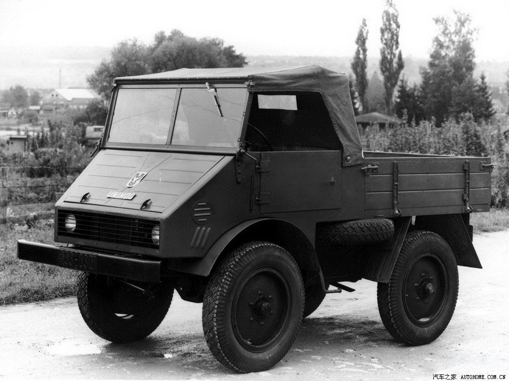 1946年下半年,弗里德里希成功地制造出第一輛試作車,有著傾斜的車頭發動機蓋,軟頂的駕駛艙,與艙后的載貨平臺,整體的造型已經與后來實際量產的車輛非常一致。在此同時,新車也首次獲得正式的命名——Universal-Motor-Gerät(泛用自走機具,universally applicable motorised machine),縮寫就稱為“Unimog”。