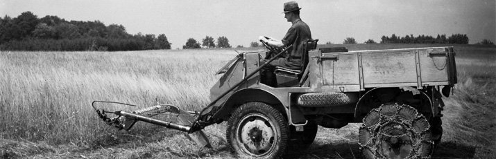 烏尼莫克的誕生就像當時的局勢(二戰時期)一樣,帶有濃厚的冒險色彩。它的發明人Albert Friedrich艾伯特·弗里德里希曾擔任戴姆勒-奔馳的航空發動機設計部門主管。早在二戰初期的時候,Albert Friedrich已有設計緊湊型拖拉機的構思,并從1945年戰爭結束時便開始烏尼莫克的開發。他起初想設計一輛與普通拖拉機不太相同的農用車。弗里德里希最初所描繪的烏尼莫克是一輛“發動機動力的農業用途泛用機具”(engine-powered universally applicable machine for agriculture),但在那時“Unimog”這個車名根本尚未成型。這輛開發中的新車使用四輪驅動系統,有四個等尺碼的車輪(一般牽引機的前后軸上之車輪往往是不同大小),可以當作牽引機、農機載臺、固定工作平臺與輸送車使用,輸出最大可達25匹馬力,擁有六速變速箱,目標最高車速50公里/小時。