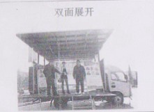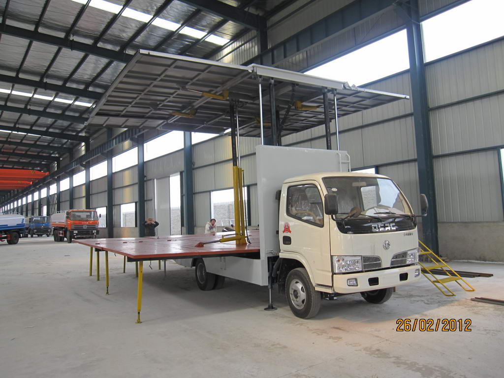 湖北程力專用汽車有限公司生產的流動舞臺車是一種方便流動演出的、并可展開成為舞臺的特種汽車,它主要包括底盤部分和上裝部分兩答部分,上裝部分由頂板側板底板組成,而側板和頂板分別由四個液壓油缸控制展開即成舞臺的臺頂,底板展開四個液壓油缸控制成舞臺,省去傳統(tǒng)搭臺程序,省時省力操作簡便安全可靠,功能齊全,外觀美觀。該車已獲國家專利。歡迎廣大客戶親臨參觀并咨詢。電話:13607289999