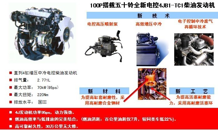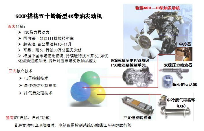 ■ 600P采用了五十鈴4KH1發動機,這款發動機是五十鈴獨家授權由慶鈴公司生產,而發動機的電子控制、最佳燃燒控制和排氣后處理都屬于尖端技術,也是別人無法仿制的。此外,600P獨有的V型外觀在推出市場時即向中國專利局申請了專利。600P上市,結束了中國商用車市場“眾鈴之爭”的局面。