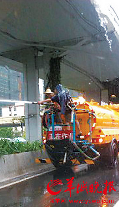 “下雨天, 回家途中見到一輛灑水車在淋路邊的植物, 真是百思不得其解! ”近日,有市民反映,連日來的暴雨都快將廣州變成“威尼斯城”,但奇怪的是, 還能看到灑水車冒著雨在路邊灑水,甚至還給綠化帶澆灌。據住在工業大道石崗路附近的居民反映,他們每天都可以見到灑水車的身影,即使在暴雨不斷的這幾天,也看到了灑水車照常作業,覺得那樣純粹是在浪費水資源。