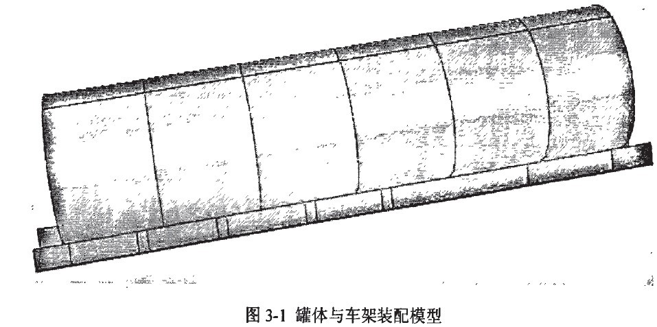 罐體總長8300mm,總寬2500mm,總高2000mm。由于鋁板的剛度小于同等規格的鋼 板,故改制后的全鋁合金罐體高度較鋼制罐體稍低,其他尺寸不變。罐體總成主要由 罐體和防波板焊接而成,車架縱梁主要由工字鋼構成,橫梁由角鋼構成,縱橫梁通過 焊接構成其車架。罐體截面采用腰鼓形截面,其優點是質心較低,穩定性較好。封頭采用平板形封頭。根據GB/T 18564[1]-2006《道路運輸液體危險貨物罐式車輛》中 的規定,相鄰二個防波板(防浪板)之間的罐體幾何容積不大于7.5m3,防波板的厚度 不小于罐體壁厚;防波板的面積應至少為罐體橫截面積的7096。本論文將模型中的防波 板厚度設計為6mm,前后一共5塊防波板。牽引銷的設計根據標準GB/T 4606《道路車 輛半掛車鞍座50號牽引銷主要尺寸和安裝、互換性尺寸》來設計。罐體總成幾何模 型如圖3.1所示: