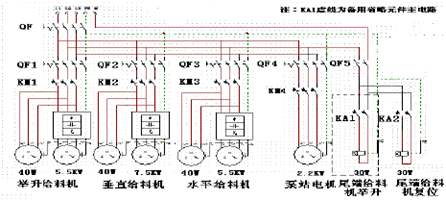 3、電動控制系統:電動控制系統是散裝飼料運輸車正常運行的重要部分,為保證螺旋輸送系統的順暢卸料,采用雙變頻器分別控制水平螺旋機和垂直螺旋機,根據不同物料選擇合適的轉速,保證螺旋輸送機高效、順暢的卸料。控制系統包含液壓油泵、水平螺旋機、垂直螺旋機、卸料螺旋機啟動和停止按鈕,操作簡單。同時還設有轉換開關,對車載發電機取力和外接三相電源方式進行切換。(見圖三電控原理圖)