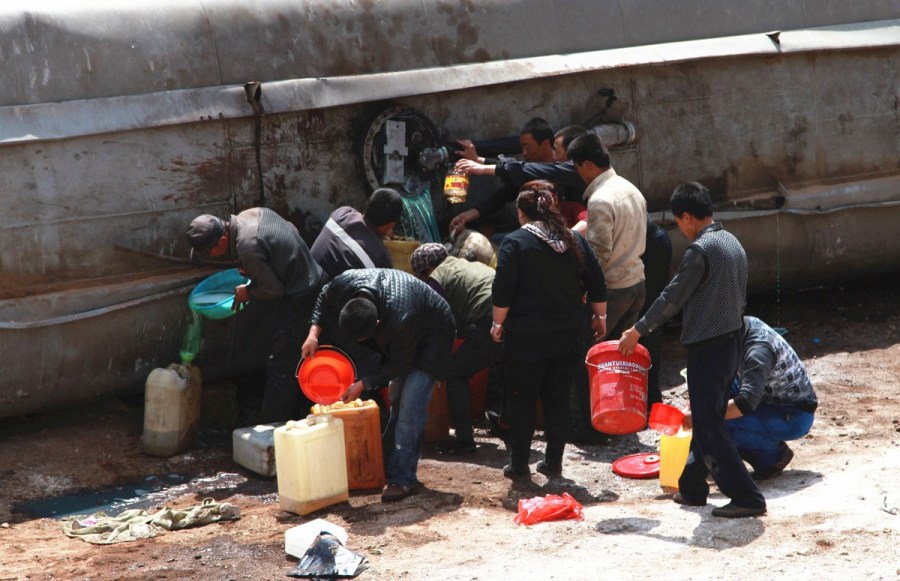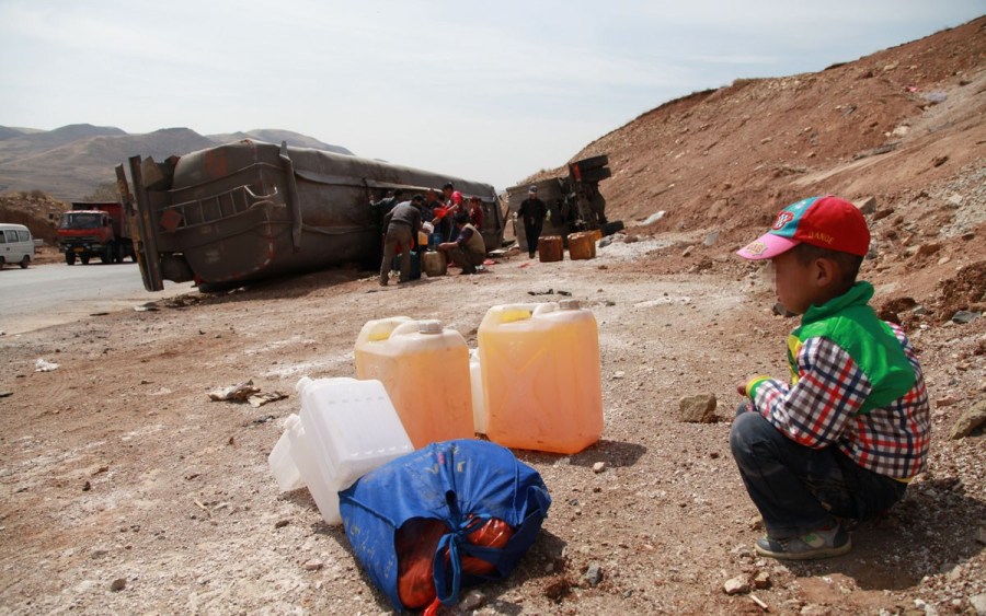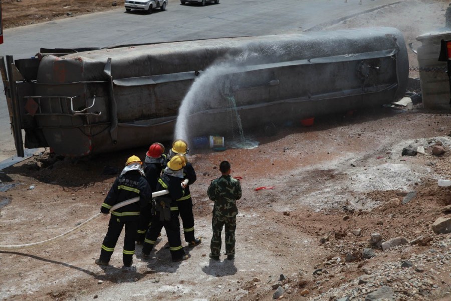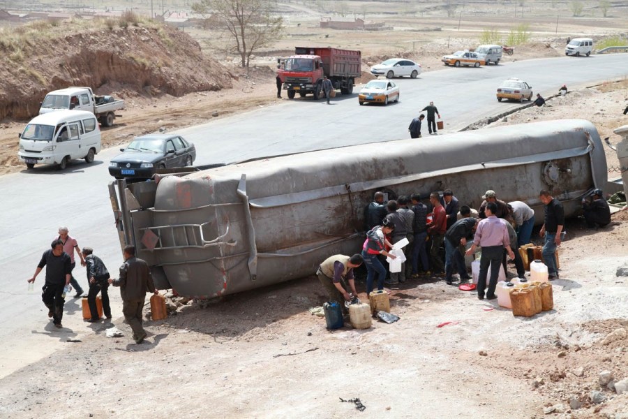 5月6日,內蒙古烏蘭察布市境內X560線29公里處,一輛發生事故的油罐車側翻在地,幾十名居住在周圍的村民和路過的人不顧危險使用礦泉水瓶、油桶以及汽車等工具從事故車輛上哄搶柴油。