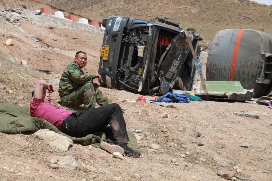 記者在現場看到,側翻的罐車躺在路上,車頭受損嚴重。旁邊散落著車體碎片以及被褥等生活用品,兩名驚魂未定的司機正在離車頭不遠處躺著。其中一位穿著粉色T恤的司機左右胳膊劃傷,額頭紅腫。記者走過去多次和他搭話,他都轉過臉去,回避記者的問題。經過多次溝通記者得知,他是駕車司機,車是從天津開來的,準備去往哈素海,他并不熟悉路況。一位坐在路邊的村民告訴記者,他已經在事故現場待了兩個多小時了,在這兩個小時的時間內,有很多人都來搶油。