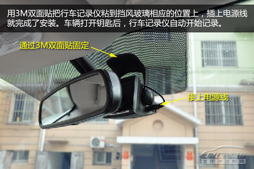 通過行車記錄儀上的3M雙面貼把行車記錄儀固定在擋風玻璃上 。把電源線插到行車記錄儀上便完成了行車記錄儀的安裝 。