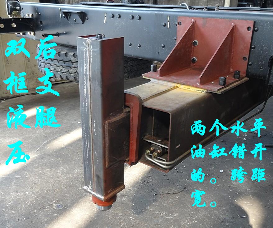 后支腿分固定后支腿和活動后支腿兩種。固定后支腿是油缸直接往下伸的。跨距比較短。活動后支腿是水平方向可以伸出來,然后再往下伸。跨距比較大,比較平穩(wěn)。