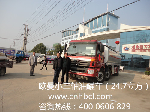 2014年熱銷中的小三軸油罐車,河南客戶來廠提車國四油罐車,這位客戶是第四次來我們廠提車了,此款小三軸油罐車選用歐曼原廠底盤,整車型號:BJ5253GYY-XA,底盤型號:BJ5253GYY-XA,采用歐曼ETX2200平頂駕駛室,國四康機210馬力發動機,大同七檔變速箱帶取力器,10噸后橋, 10.00R20輪胎,380L鋁合金油箱、空調、前盤制動,ECU電子限速,ABS,排氣管前置;小三軸油罐車罐體容積:24.7立方,罐體采用武鋼國標鋼材制作,罐體平分二倉二個罐口,帶一個三通連接,帶泵,二個2.5寸自流閥,罐體顏色金屬漆,貼“爆”及反光標貼。下面小編展示一下些款小三軸油罐車靚照: