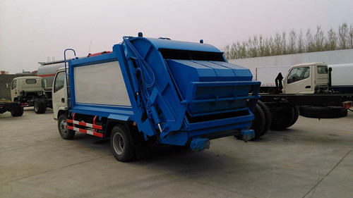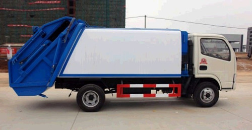 2、壓縮式垃圾車壓縮方式:前后壓縮:當填料斗裝滿垃圾后,刮板打開,滑板帶動刮板一起向下移動,插入垃圾中進行破碎和首次壓縮,刮板向前回轉,進一步壓實垃圾,刮板到位后隨滑板向上移動,將垃圾壓實并裝填到垃圾箱中,然后回到起始位置。整個工作過程自動控制,在垃圾連續不斷的壓填時,推鏟在擠壓力的作用下,克服背壓逐步后退,實現垃圾的雙向壓縮并均勻地分布在整個垃圾箱。當壓縮式垃圾車在處理(或填埋)場卸出垃圾時,舉起填裝器,推鏟向后移動,沿水平方向將垃圾箱里的垃圾推出。