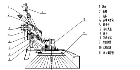 如圖所示,避讓機(jī)構(gòu)由油缸1、調(diào)節(jié)桿5和連桿7組成。調(diào)節(jié)桿5和連桿7一端均與固定架鉸接,另一端與掃盤(pán)組件9鉸接。掃盤(pán)組件9通過(guò)調(diào)節(jié)桿5和連桿7組成的平行四邊形機(jī)構(gòu)來(lái)實(shí)現(xiàn)上下平移運(yùn)動(dòng),同時(shí)通過(guò)連桿支座實(shí)現(xiàn)水平旋轉(zhuǎn)運(yùn)動(dòng)。油缸1一端鉸接在油缸調(diào)節(jié)桿11上,另一端鉸接在萬(wàn)向鉸座8上。掃盤(pán)組件9的外伸下降和內(nèi)收提升動(dòng)作由油缸1控制。在固定架和連桿7之間設(shè)置了拉簧2,拉簧2上端固定在車架上,下端與連桿7相連。利用拉簧的拉力使掃盤(pán)組件9保持在預(yù)定位置,調(diào)節(jié)拉簧調(diào)節(jié)筒4可改變彈簧2拉力的大小。