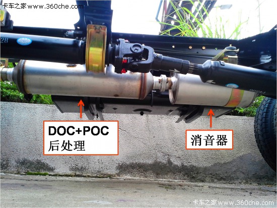 三、找DOC POC后處理系統(tǒng)。這是最容易辨識(shí)的標(biāo)志,只需要蹲下來(lái)從車底看排氣管上是否有兩個(gè)柱形罐狀裝置。國(guó)III車只有一個(gè),即消音器;而國(guó)IV車則有兩個(gè),其一為消音器,另一為DOC POC后處理系統(tǒng)。