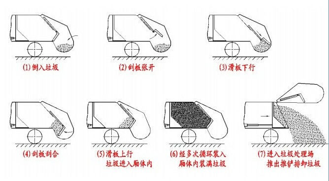 2) 當裝填垃圾至滑板上行不能到達上止點位時,說明垃圾已經裝載,不可再強行裝載,應立即停止工作,以免超載。