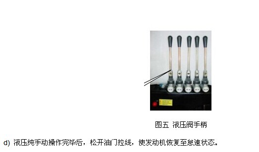 b)采用液壓閥手柄操作時,發(fā)動機不能處于怠速狀態(tài),務必使發(fā)動機轉速高于 1200轉/分(可調整油門拉線)。