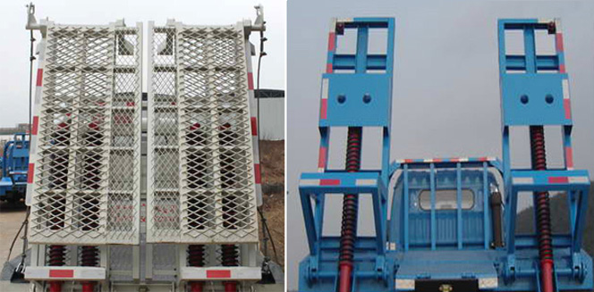此款藍(lán)牌挖機(jī)運(yùn)輸車(chē)可設(shè)計(jì)成向后伸長(zhǎng)500mm,可運(yùn)載80-120挖機(jī),平板面采用5mm厚國(guó)標(biāo)花紋板,橫梁采用100x100x5的國(guó)標(biāo)方管,橫梁加密,每300mm一根橫梁,邊框使用120槽鋼固定,平板運(yùn)輸車(chē)的承載能力更大,受力更均勻;尾部帶有雙彈簧爬梯和可折疊式支腿,爬梯上焊有16的螺旋鋼,板面上也焊有螺旋鋼,挖機(jī)上去的時(shí)候不會(huì)打滑,在挖機(jī)上去的時(shí)候?qū)⒅确畔拢?點(diǎn)著力,車(chē)頭不會(huì)翹起,安全性能更強(qiáng)。