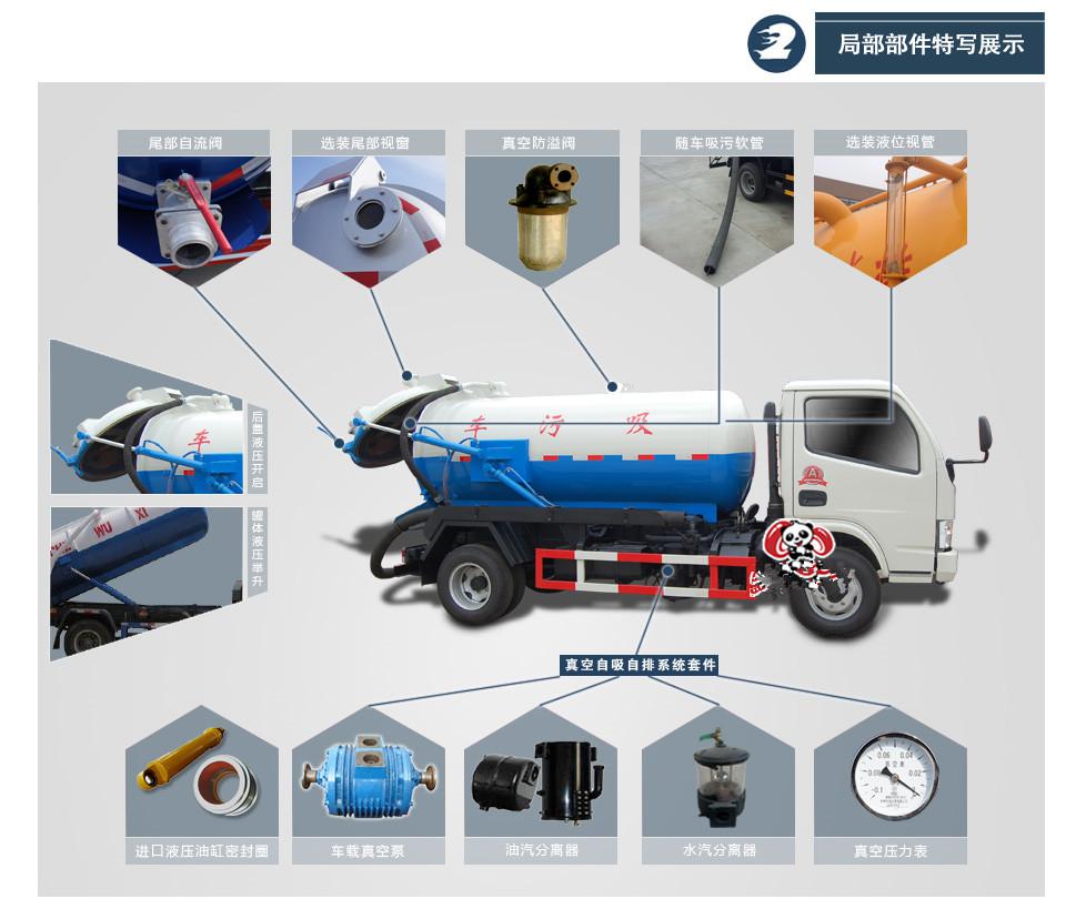 吸污車罐體可采用:碳鋼、不銹鋼。 吸污車專用部分由取力器、傳動軸、專用真空吸污泵、高壓成型糞罐、水氣分離器、油氣分離、多路換向閥、 吊桿、吸污槍,管網(wǎng)系統(tǒng)組成,并裝有真空壓力表、視污窗(管),洗手裝置。
