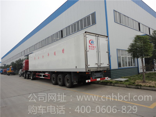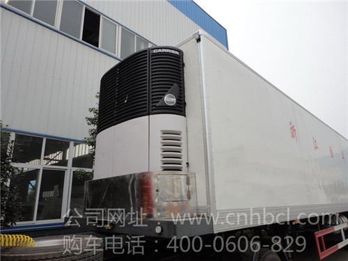 2.廂體部份: 貨廂內尺寸(mm): 13820×2330×2360,采用內外玻璃鋼蒙皮材料,中間保溫層采用聚氨酯發泡切片經真空負壓一次復合成型, 保溫層厚度8厘米,廂體形成一種封閉性板塊,在拼裝廂體時用高強度膠粘結在一起,并用內埋高強度螺釘進行緊固,半掛長度太長,底部鋪裝鋁合金通風槽,制冷機組采用美國開利合資K牌SK1800型半掛獨立機組,廂內溫度-12度左右。