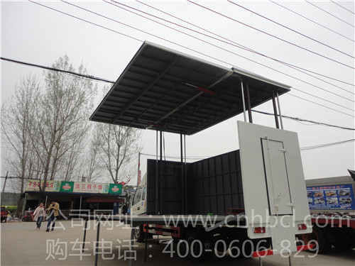 展開說明:廂體頂部半掀起,側廂體放睛作為舞臺板,車頭及尾各加一塊音響平臺,及廣告屏風,4.2米廂體,配舞臺梯一部,標配舞臺外的可以選 裝。 |