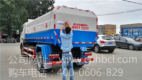 司機正在為這臺8方側裝掛桶式垃圾車貼臨時牌照