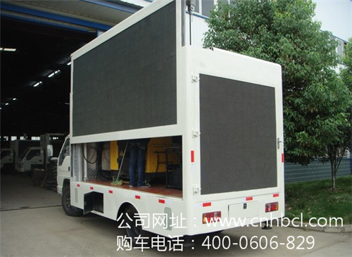 該款LED廣告車整車尺寸為:5380X1690X2800(mm) 廂體內尺寸為:xx(mm)。整車標準配置為豪華鋁合金內飾、380V50米外接電源線,駕駛室左側為P10全彩高清顯示屏,右側為滾軸燈箱加單紅色條屏可連續翻滾六副廣告。后門為單紅色屏幕,另該車可接市電220V。