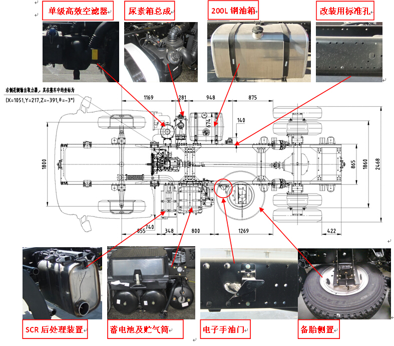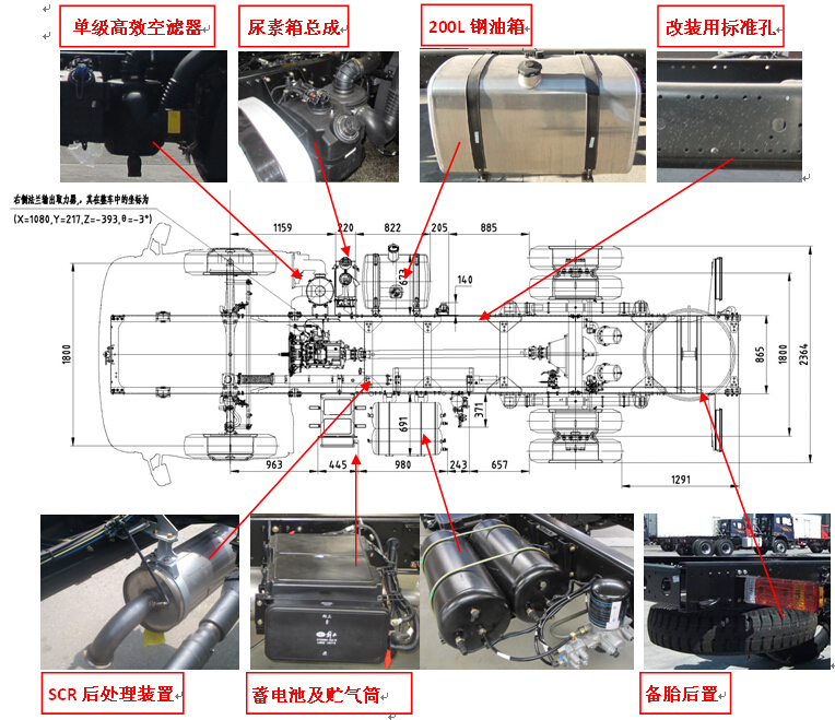 圖1 CA1160P62K1L2A1E4Z型環(huán)衛(wèi)車底盤(pán)布置圖及細(xì)節(jié)圖