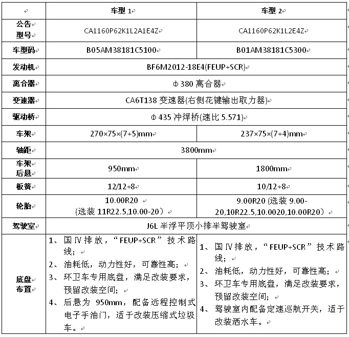 為滿足市場(chǎng)需求,解放公司開(kāi)發(fā)了J6L國(guó)ⅣCA1160P62K1L2E4Z及CA1160P62K1L2A1E4Z型專用4×2環(huán)衛(wèi)車底盤(pán)。該系列底盤(pán)發(fā)動(dòng)機(jī)功率范圍涵蓋121—165kW,采用“FEUP+SCR”技術(shù)路線,達(dá)到國(guó)Ⅳ排放,具有動(dòng)力性好,油耗低,可靠性高等特點(diǎn)。本次推介3800mm軸距的環(huán)衛(wèi)車底盤(pán),適于改裝壓縮式垃圾車和灑水車。