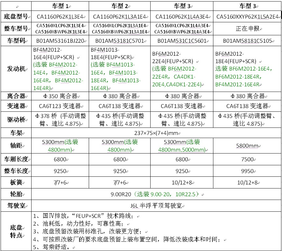 在解放新開發(fā)的J6L國Ⅳ系列中型車基礎上,根據(jù)冷藏車特性新開發(fā)專用底盤, 滿足用戶需求,具體配置如下: