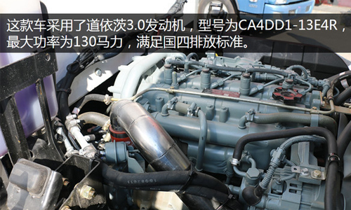 這款車發(fā)動機采用的是道依茨3.0L雙壓縮機,型號為CA4DD1-13E4R,最大功率為130馬力,滿足國四排放標(biāo)準(zhǔn)。與其搭配的是萬里揚五檔手動變速箱,型號為WLY5-35。