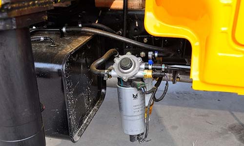 液壓油箱加裝在車輛一側,為上裝液壓部件工作提供了足夠的原動力,油箱上還有一個溫度顯示儀,標有攝氏度和華氏度兩種顯示刻度,方便用戶掌握情況。