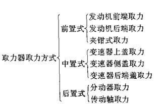根據取力器相對于汽車底圖騰變速器的位置,取力器的取力方式可分為前置,中置和后置三種基本型式,每一種基本形式又包括若干種具體結構,如下所列。