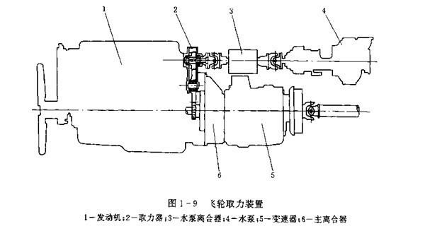發動機后端取力一般都是在飛輪處。圖1-9是一種飛輪取力的布置方案,在飛輪前端的齒輪,通過中間軸齒輪傳動取力器齒輪,從而驅動取力器的輸出軸。這種取力方式的優點是不受主離合器控制,但因改變了曲軸未端的結構,對于平衡會有一些影響,這種布置在機場消防車上有所應用。