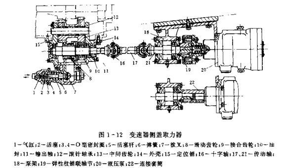 圖1-12為某種變速器左側蓋取力器,它由取力器齒輪箱,操縱機構,傳動軸,泵架等組成,取力器殼體14由定位銷15定位,用螺栓緊而在汽車變速器的左下方。