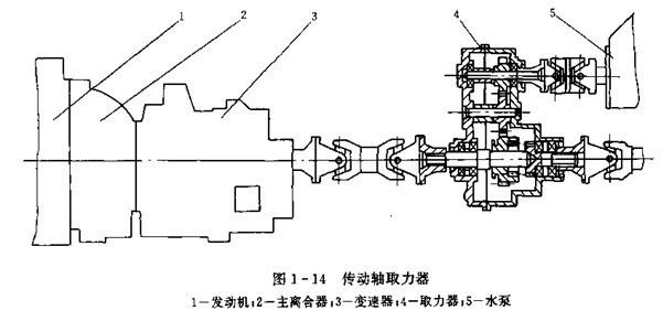 傳動軸取力是將取力器作成獨立總成,設置于傳動軸之間,圖1-14為其中的一種結構形式。