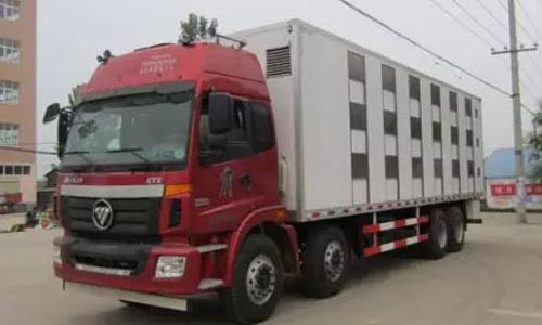 歐曼前四后八畜禽運輸車箱體為全不銹鋼保溫結(jié)構(gòu),方便車體的衛(wèi)生清潔。外部部分玻璃鋼飾板;