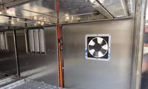 3、恒溫系統(tǒng)。由車載制冷機,暖風(fēng)機,氣體混合輸送倉,排風(fēng)扇等組成,實現(xiàn)仔豬生存空間氣體的流通和恒溫。為保證運輸過程中對溫度的控制,畜禽運輸車采用雙系統(tǒng)制冷空調(diào),且箱體兩側(cè)設(shè)計三排帶電動排氣扇的通風(fēng)口和百葉窗,夏季通過空調(diào)實現(xiàn)箱內(nèi)降溫。為解決冬季畜禽運輸采暖,采用獨立的水暖系統(tǒng),采用智能巡檢儀,保證車廂內(nèi)恒溫28-32℃,在駕駛室就能實時監(jiān)測箱內(nèi)的溫度變化,便于控制溫度。