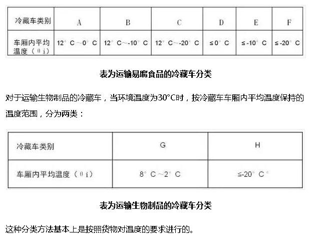 對于運輸易腐食品的冷藏車:當環境溫度為30°C時,按冷藏車車廂內平均溫度保持的溫度范圍,分為以下六類:
