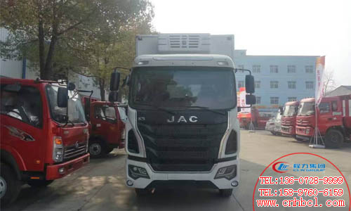 國五江淮格爾發冷藏車整車型號:HFC5161XLCP3K1A57V型冷藏車 ,底盤型號:HFC5161XXYP3K1A47V,軸距:4700mm,5000mm,外形尺寸:8580,9230,10000X2550X3950(mm),貨廂尺寸:6230,6830,7600X2350X2430 (mm),總質量:16000(Kg),額定載質量:8805kg,整備質量:7000kg。