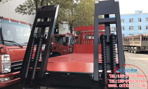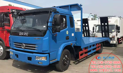 國五東風多利卡平板運輸車,發動機可配朝柴 玉柴,6檔變速箱,7噸后橋,8.25鋼絲胎、整車長8米,板面凈長5.2米,專拉120以下挖機。國五東風多利卡平板運輸車圖片展示: