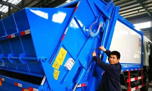 壓縮垃圾車專業廠的續榮師父在精心調試成品車性能,認真的樣子旁若無人。