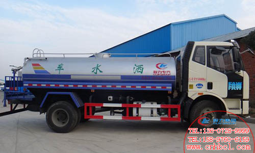 國五解放J6L綠化噴灑車改裝配置:罐體實際容積為:12立方米(12噸水).罐體外形尺寸:5000/2100/1350(長/長軸/短軸)(mm)。整車配備:前沖后灑、側噴、后置式工作平臺、平臺上設置有高壓水炮.配備優質大功率專用灑水泵,取力器,雜物過濾網,國標通用65型消防接口、1套自流球閥系統,2根引水鋼絲膠管(帶陰陽快速接頭),配鎖,水位計,作業高音喇叭.兩側及后加強型保險杠,防滑爬梯,膠管儲存筒等等.