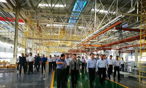 程力集團總經理程阿羅(前排左一)、市委書記陳安麗(左二)、市長郄英才(前排右二)、曾都區區委書記何運平(右一),在程力商用車生產車間考察現場。