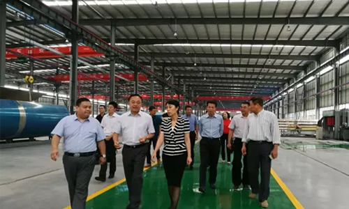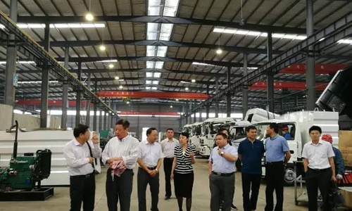 調研考察團在新試產的輕量化鋁罐車生產車間現場,走在前排的依次為市委書記陳安麗、曾都區區委書記何運平、程力集團總經理程阿羅。