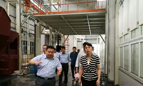 程阿羅總經理(左)陪同市委書記安麗(右)參觀自動噴涂生產線,車間內無塵、無味、無污染,是國內十分先進的環保涂裝生產設備設施。