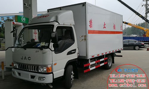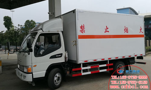 國五江淮駿鈴4x2易燃液體廂式運輸車廂體內尺寸mm: 4140X2000X1800, 外板采用1.2MM厚冷軋板一次成型的百葉窗,內飾為導電性能良好的鋁板,內襯為矩形管骨架牢固穩定,內部為5厘米透氣,防潮,阻燃泡沫板,經過現代化工藝復合而成。廂內有固定貨物的臥環,配有車載專用煙霧報警器和后門防盜器,有靜電帶,滅火器,防火罩。整車國標反光標示及警告標志。主要運輸介質為三類危化品,包括油漆涂料等.廂體中間一單開側門.