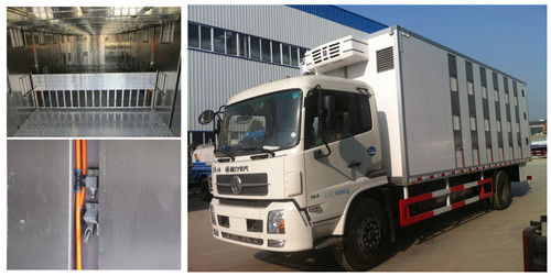東風天錦7.6米豬仔運輸車箱體為全不銹鋼保溫結構,外部部分玻璃鋼飾板。