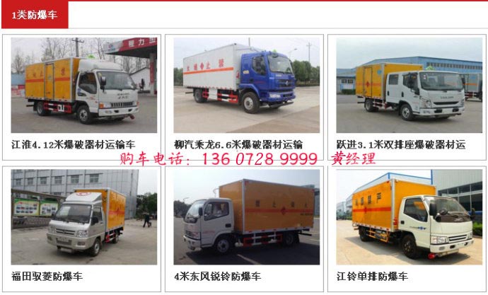 一類易燃易爆危險品車:運輸介質:黑火藥,壓縮黑火藥,電引爆雷管,爆破炸藥,點燃導火索,硝胺炸藥;運輸爆炸品的項號:1.1D,1.1D,1.1B,1.1D,1.4G,1.1D